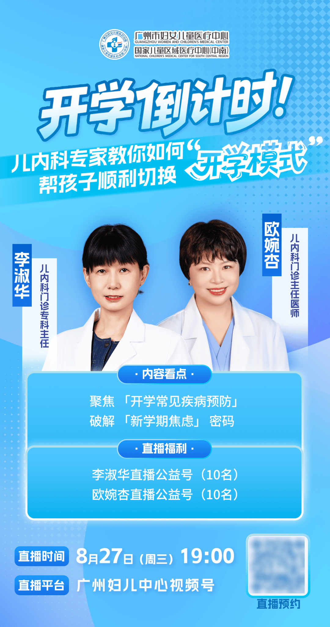 8月27日(周三)19:00-20:30,我们专门邀请了广州妇儿中心儿内科门诊专科主任李淑华做客直播间,与家长们共同聊聊开学季常见病毒感染的预防与应对。